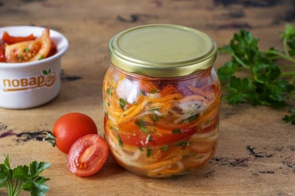 Описание приготовления: Ниже я расскажу подробнее, как приготовить помидоры по-корейски без стерилизации на зиму. Вес всех овощей указан уже в подготовленном, нарезанном виде. Помидоры выбирайте плотные, небольшого размера. Хорошо подойдет