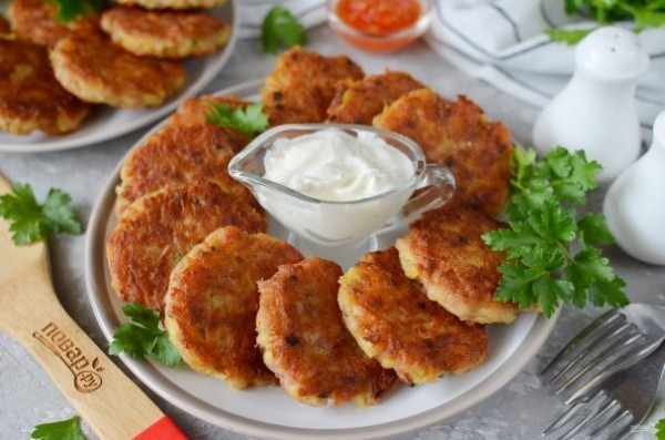 Описание приготовления: Для приготовления драников картофель нужно натереть на крупной терке, добавить немного тертого сыра, специй, яйцо и немного муки. Картофельная масса ароматная, густая, набирайте ее ложкой, выкладывайте в горячее
